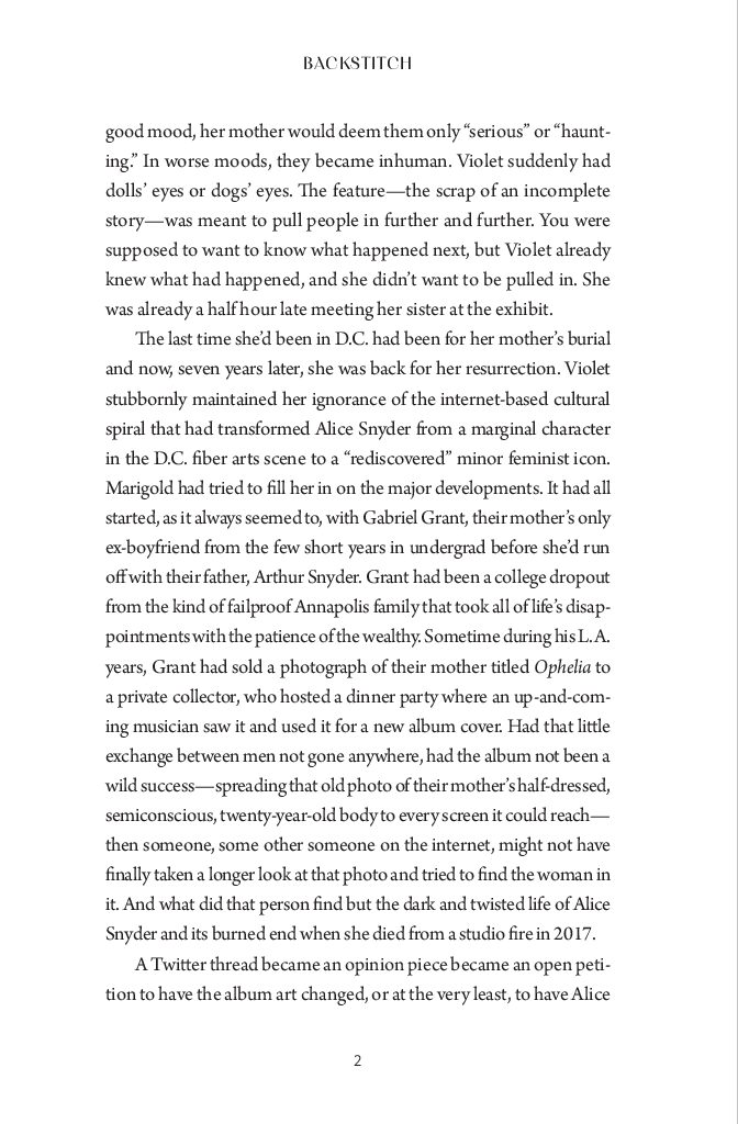 Set in an art gallery in the Washington, DC area, and structured as a journey through the gallery’s rooms, BACKSTITCH is the story of two sisters who reunite at a retrospective of their troubled mother’s art and must confront the consequences of her ambition and the difficult, private truths behind the family’s public narrative. The novel is an exploration of family ties, the gift and cost of artistic talent, and the legacy that the artist’s daughters must carry.